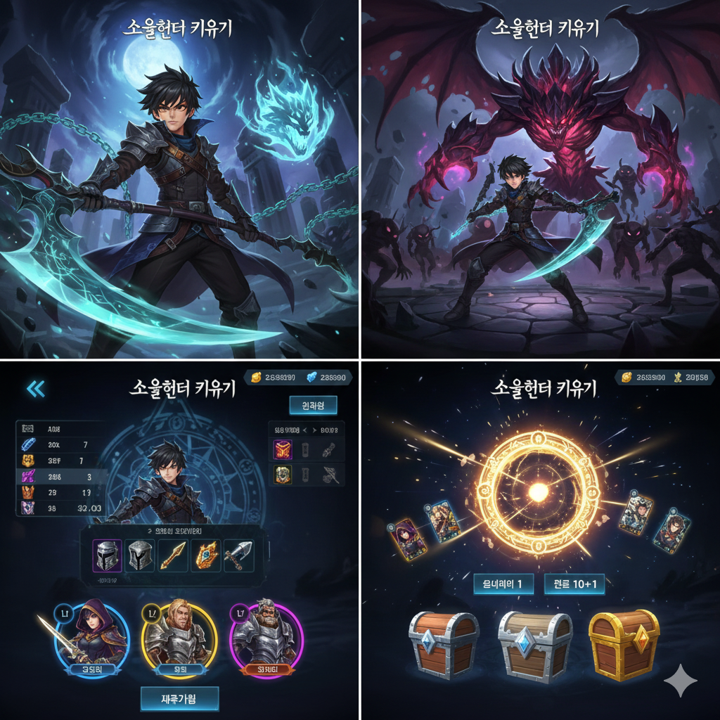 소울헌터키우기는 헌터 수집과 스킬 시너지가 핵심인 방치형 RPG입니다. 초보자는 무기 소환부터 집중하고, S티어 헌터를 우선 육성하세요. 무과금도 꾸준히 하면 100층 돌파 가능합니다[web:47][web:54].